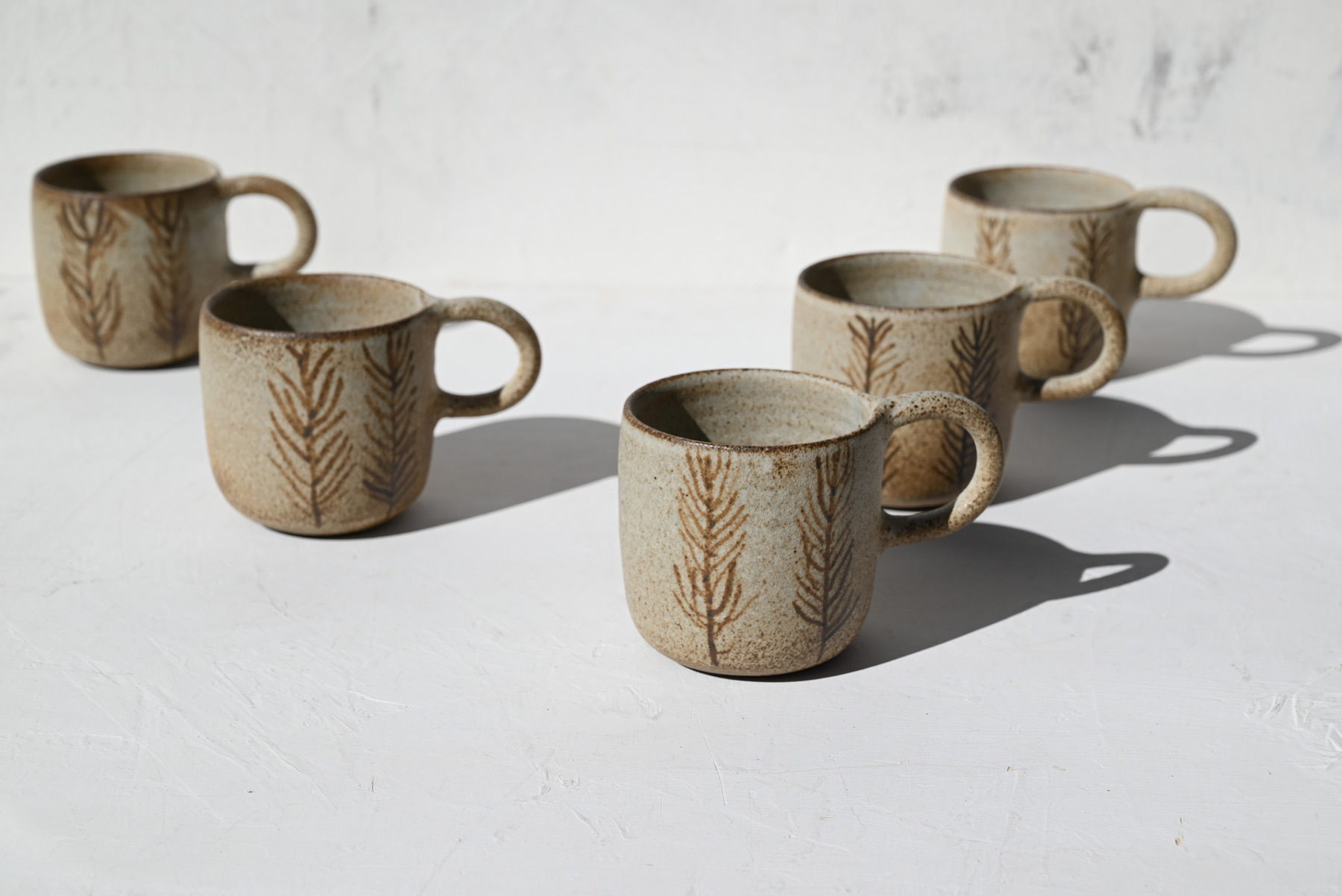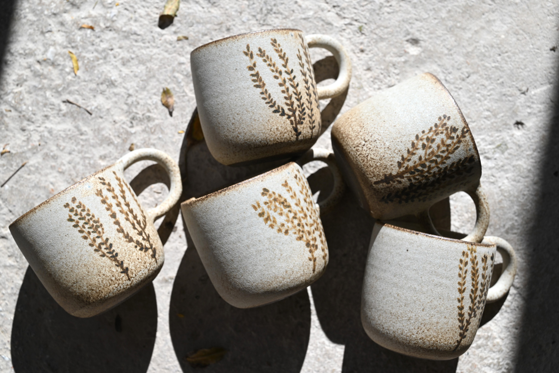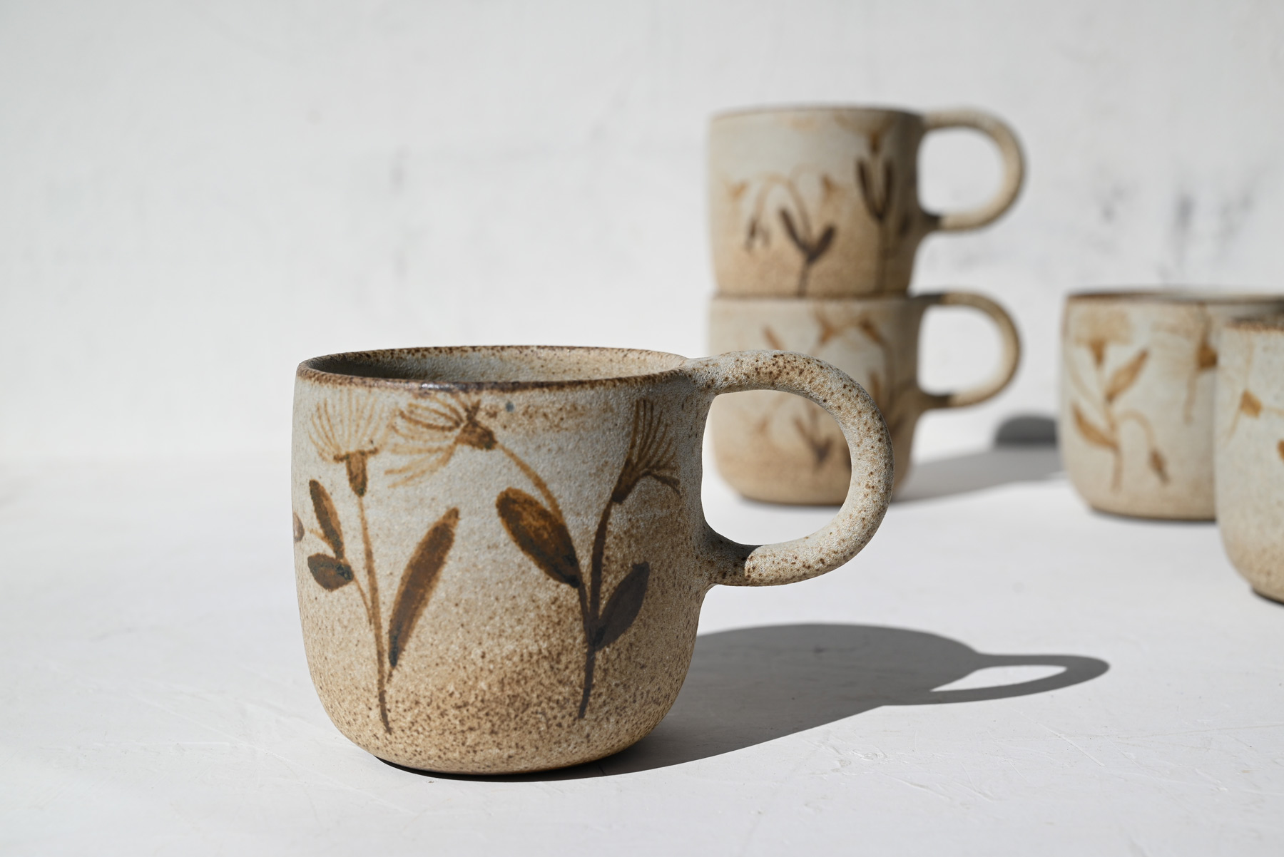 | Χειροποίητες κούπες ζωγραφισμένες με λεπτομέρειες από φυτά και άνθη. |