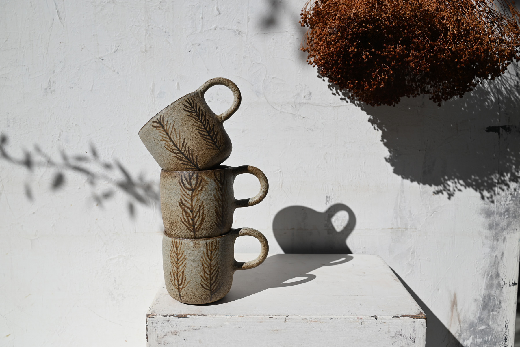 Μια κούπα κατασκευασμένη από πηλό, “φτιαγμένη” στο χέρι και ζωγραφισμένη σε τρεις ξεχωριστές εκδοχές.Εμπνευσμένη από την ομορφιά που συναντούμε μέσα στην φύση και σε ένα αποτέλεσμα γήινων αποχρώσεων.